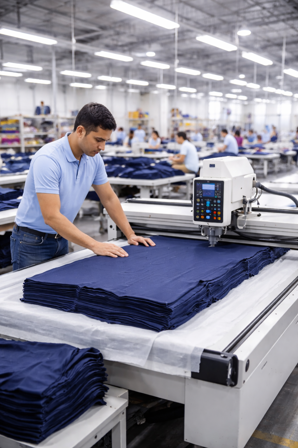 Once patterns are finalized, fabric cutting begins. In modern manufacturing units, cutting is done using industrial cutting machines that can handle multiple layers of fabric at once.